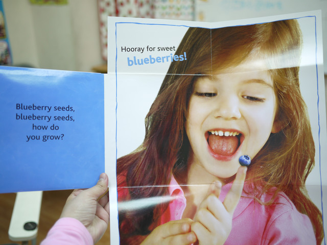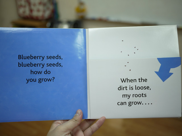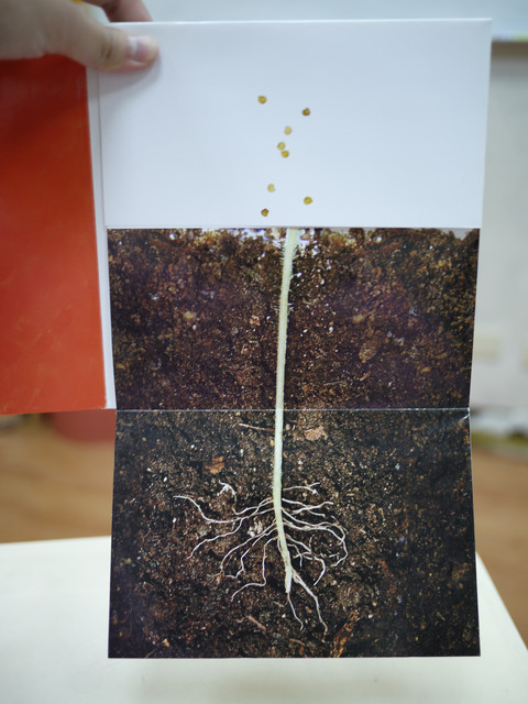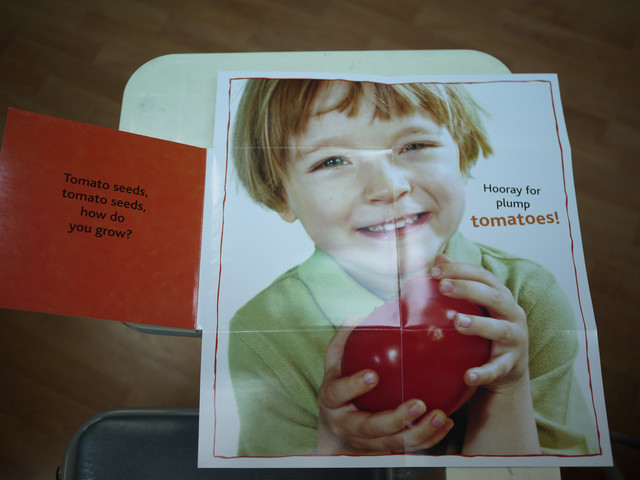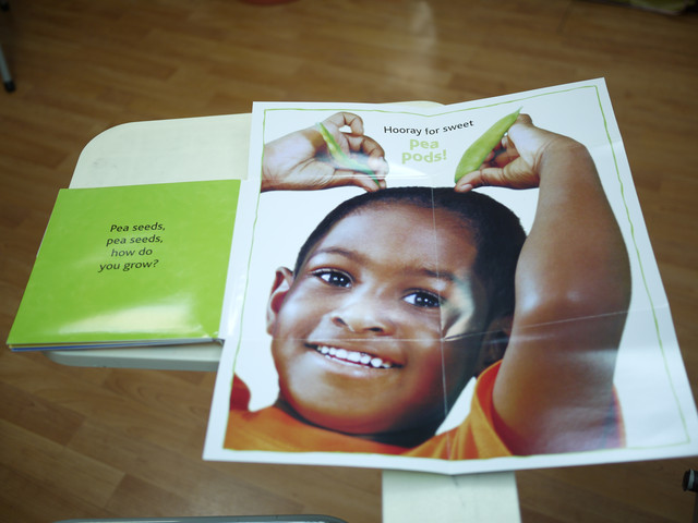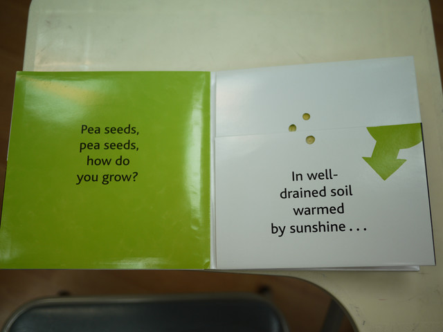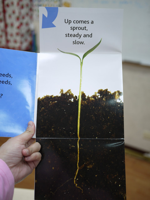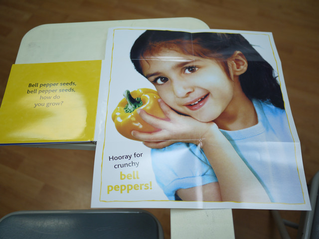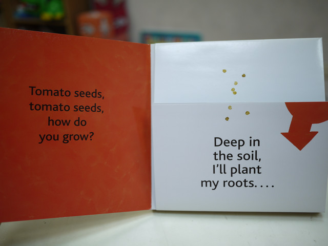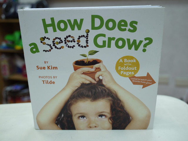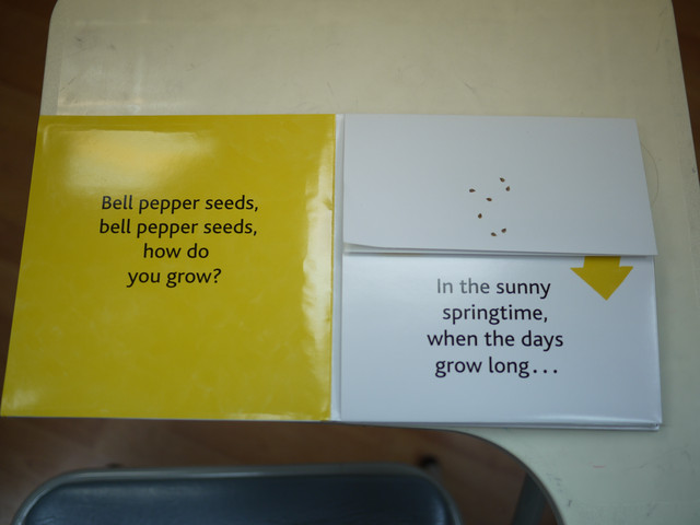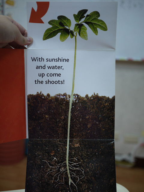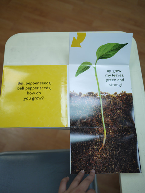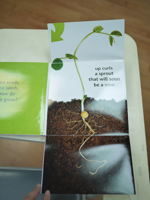 這是大黃瓜。這個,應該很熟悉吧,地瓜葉。白色的一朵小花,是豌豆的花。昨天,想著要跟幼美班的孩子們講一本植物的繪本。How Does a Seed Grow是最適合不過的,內容簡單明白,小朋友很能理解。首先介紹的是toamto。我們用英文討論,大家是否喜歡tomato?也討論了我們吃tomato的方式。聰明的孩子說,還可以做成番茄醬,或許他們還沒學過ketchup這個字,所以是個好時機,順便教新單字!下圖,右邊的折頁,是可以上、下翻開的。 往下翻可以看見根部。This is how it grows under the ground. We call them "roots." 小朋友其實很驚訝,他們張大了眼睛看呢! 往上翻開來,可以看到葉子!再往右翻開來,變成一幅超大幅的圖畫---Hooray for plump tomatoes! Next one... 再來看一個... pea,就跟我拍到的照片長得一樣喔。Wow! Hooray for sweet pea pods! 你知道彩椒的英文怎麼說嗎?書裡介紹的是bell pepper(鐘形辣椒)。每一篇的最後都有Horray! 是不是很可愛的一本書,又很有知識性呢?像我這樣喜歡植物的人,真的會很喜歡這種繪本。我在介紹給小朋友之後,看到他們的光彩笑容,覺得好滿意。閱讀,讓我們的世界變大了,知道的事情更多了。 但願我們來學習植物強韌的生命力。努力過後的收穫,也要大聲說Horray!