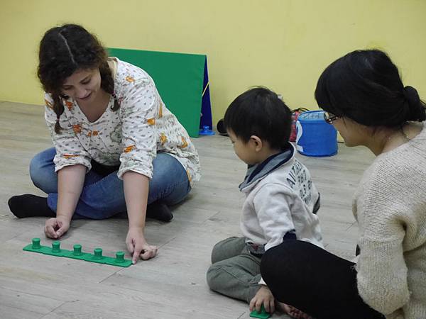 老師會讓每位小朋友到她面前,拿一組教具給媽媽、一組給自己。