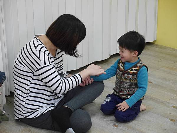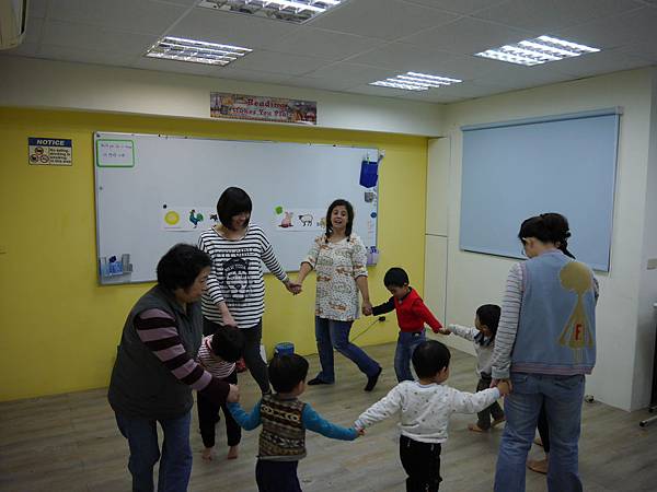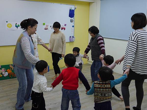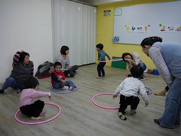 課程進入尾聲,此時,老師會請小朋友和媽媽都坐下,互相擁抱,我們將全部的燈都關掉,音樂也換上輕柔緩慢的音樂,你也可以躺在地板上..... .