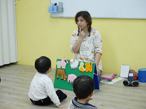 老師運用不織布教具和板子,先初步介紹動物的名稱和叫聲喔。會讓小朋友猜猜看喔!非常吸引人。