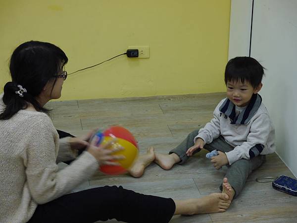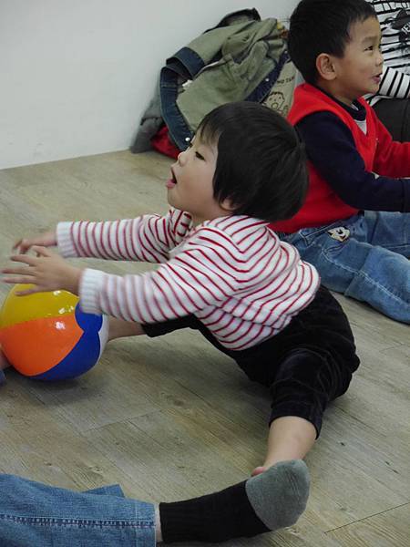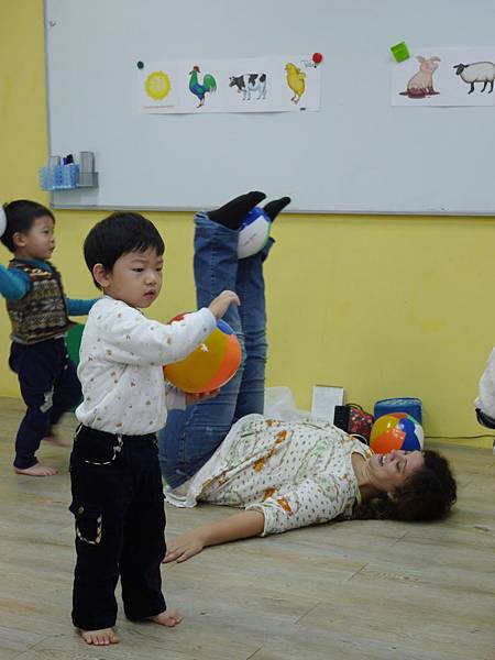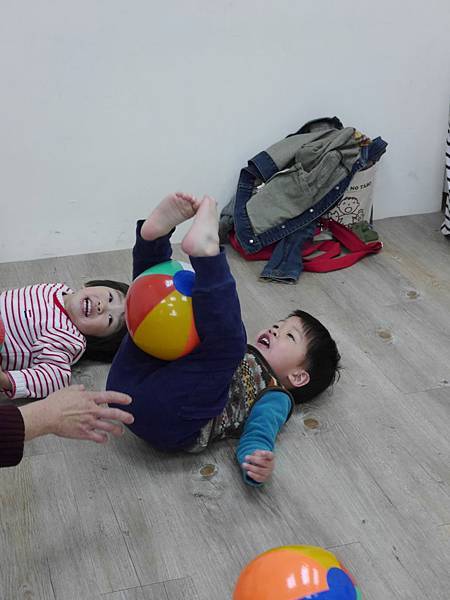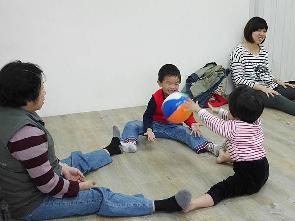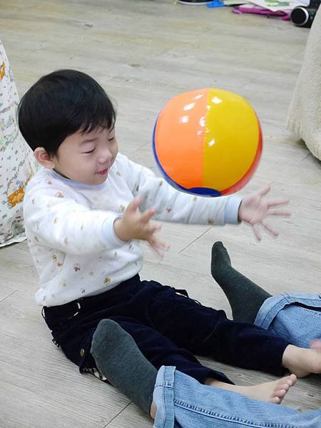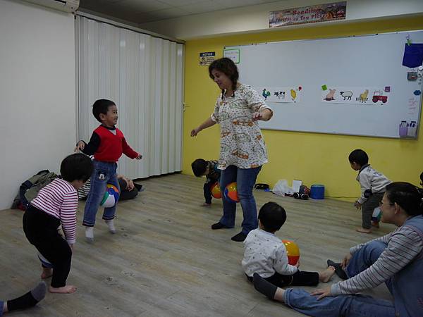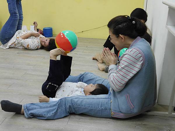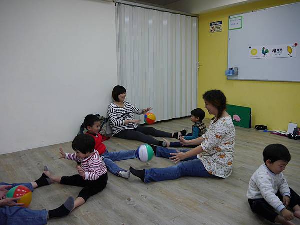 Catherine 老師引導媽媽和孩子們坐下,用雙腿圍出一個範圍,然後再音樂節拍裡,玩丟球遊戲。