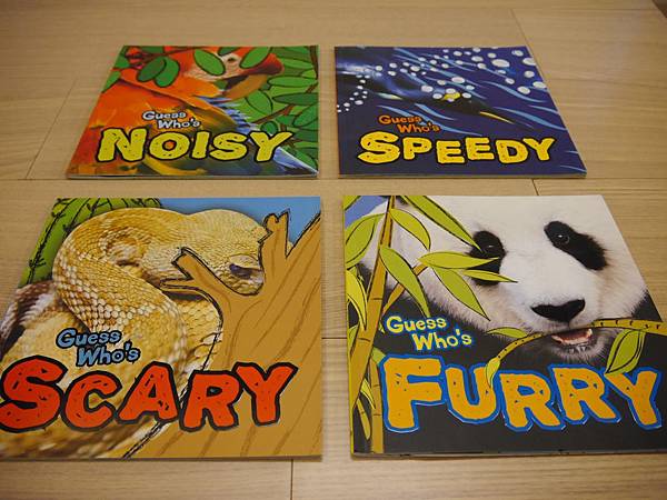 一套四本,Guess Who's Noisy / Speedy / Scary / Furry? 帶點科普、動物知識的繪本。