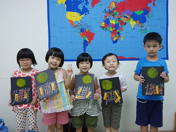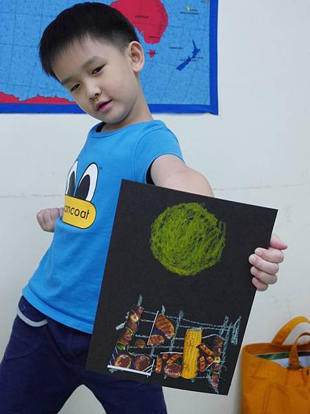 勞作部分,採用「黑心卡」,讓孩子們以蠟筆作畫,貼上烤肉食材的圖片(事先從google 找圖印出來),呈現中秋節烤肉賞月的情景。